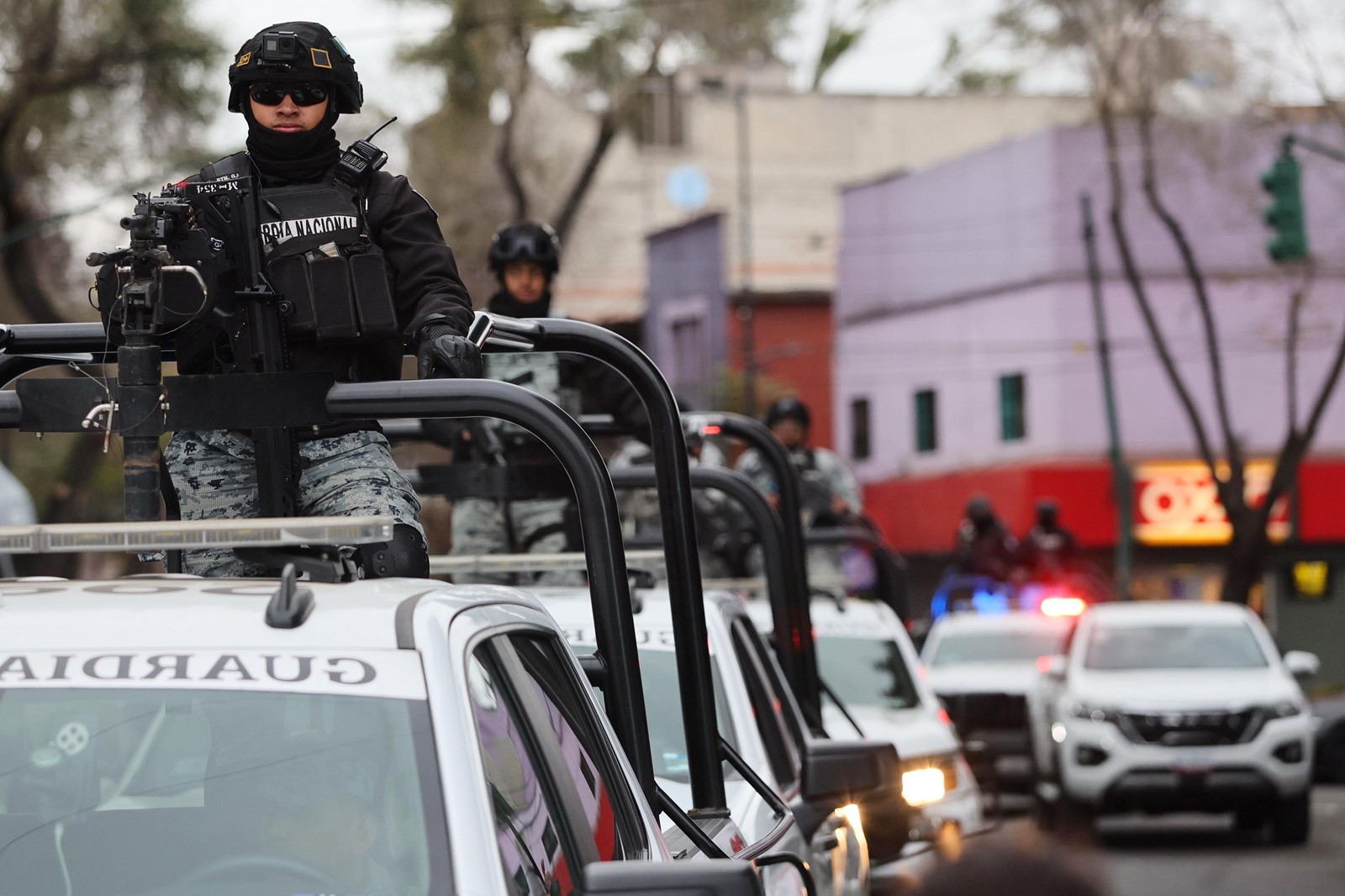 National Guard troops patrol outside the general prosecutor's headquarters in Mexico City on Sunday after authorities reported that the Mexican Army killed the Jalisco New Generation Cartel leader in an operation intended to capture him. Ginette Riquelme - AP.