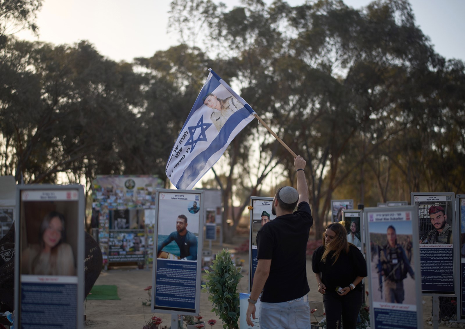 A relative waves a flag with a picture of Raz Mizrahi, who was killed Oct. 7, 2023, in a cross-border attack by Hamas militants, as he visits the memorial site of Nova music festival, near the Kibbutz Reim, southern Israel, on Monday. Leo Correa - AP.