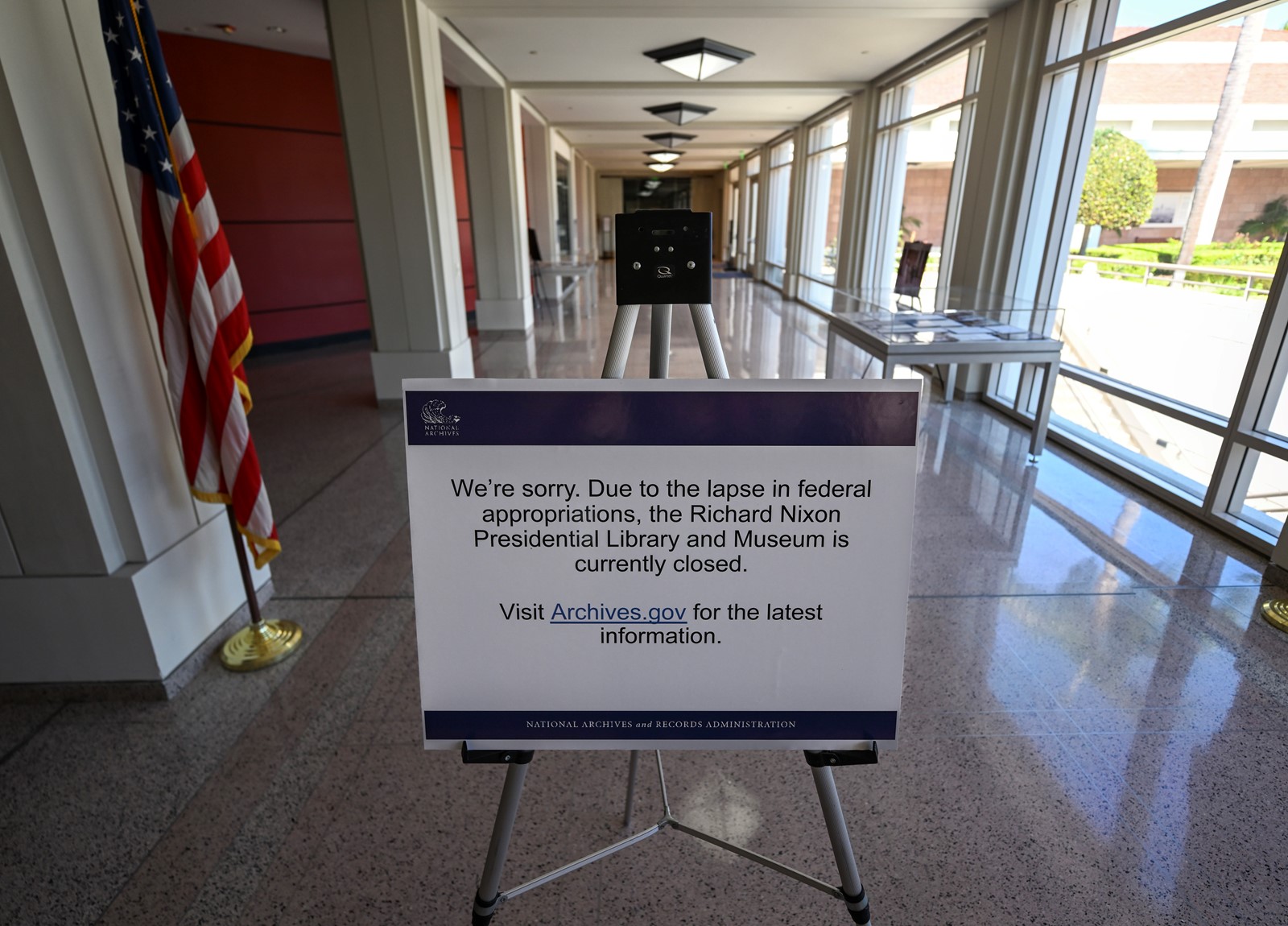 A sign tells visitors that part of the Richard Nixon Presidential Library and Museum in Yorba Linda is closed Wednesday because of the federal government shutdown. Jeff Gritchen - staff photographer.