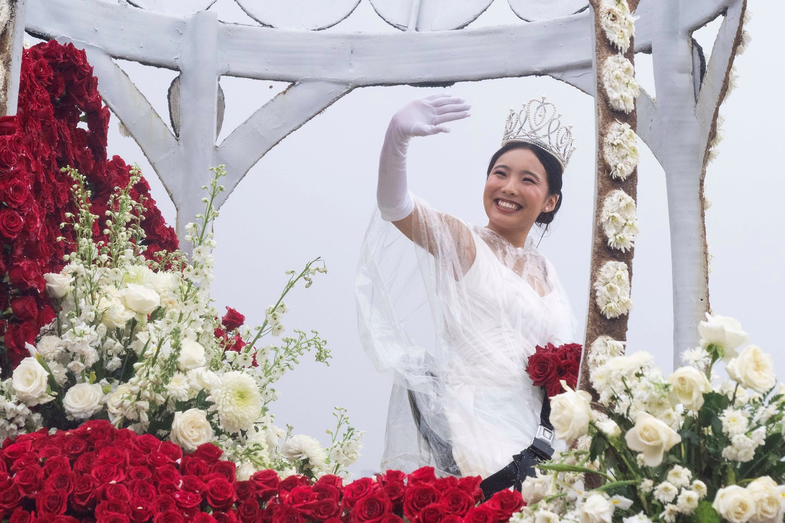 The 2026 Rose Queen Serena Hui Guo waves to the audience during the 137th Rose Parade in Pasadena on Thursday. Drew A. Kelley - staff photographer